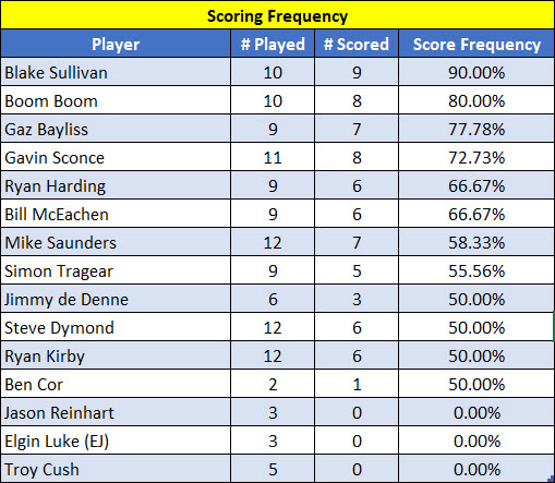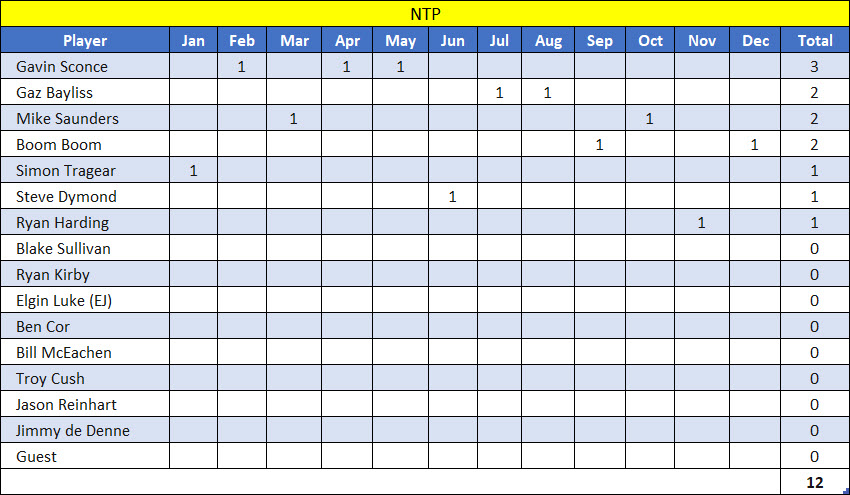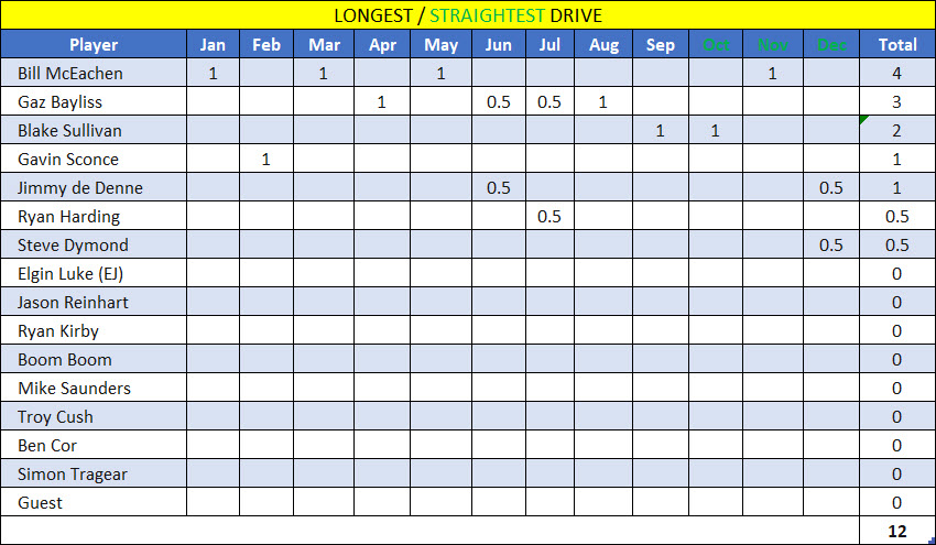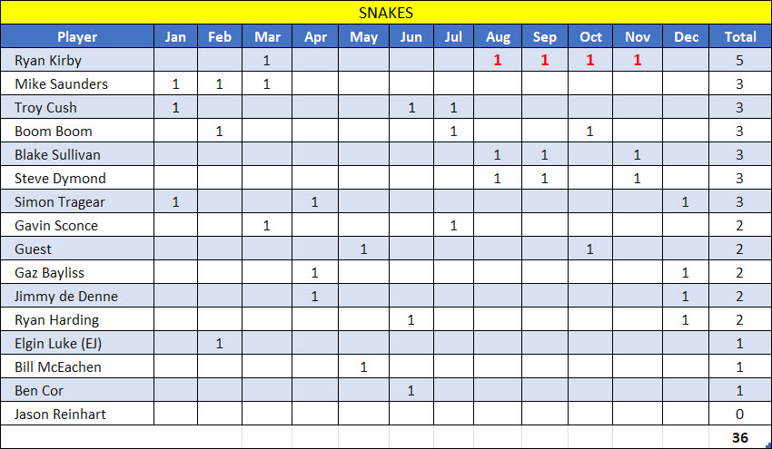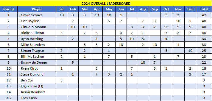 Getting right to it, Simon played his best round of the year to win on 37 points, ahead of Blake on 35 who took 2nd from Boom on a count back, also on 35. Since Simon was out of the running for the championship, his win was pretty fucking irrelevant in the whole scheme of things. What was of most interest was the tightly-contested title of Annual Champion, with the top six all in the running to take it out. After all but Ryan scored points in November, this is how the leaderboard looked leading into December: