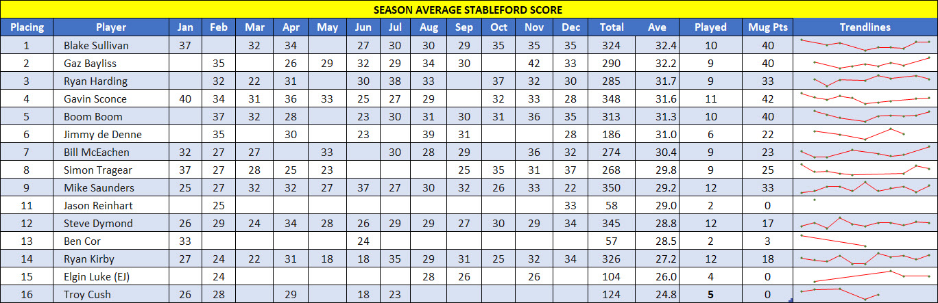……. Meaning that congratulations go to Gav for taking the Annual Championship on 42 points!! Well done, mate, you played some amazing golf last year! The other thing to really highlight is that it seems Ryan, who finished the year on 33 points, did not score in the last 2 Mugs, so perhaps it’s worth assessing if his shitting of the bed over the last 2 Mugs was the most significant of all the contenders?!?! 😂 You be the judge. The final standings are in the table below this scintillating analysis! 😊